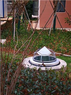 光导照明系统的加入成了小区景观的一大亮点,钻石型采光罩与小区景观相结合相得益彰,通过该系统将自然光导入地下停车场,直接省去白天的电力消耗,实现节能减排与绿色照明!
