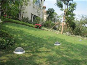 美林湖商业街的营销中心前面的草地上,可以看见有几个低调又不失优雅的采光罩,高透光的类特警盾牌PC材料做成的采光罩旁边有银白色的铝圈装饰。