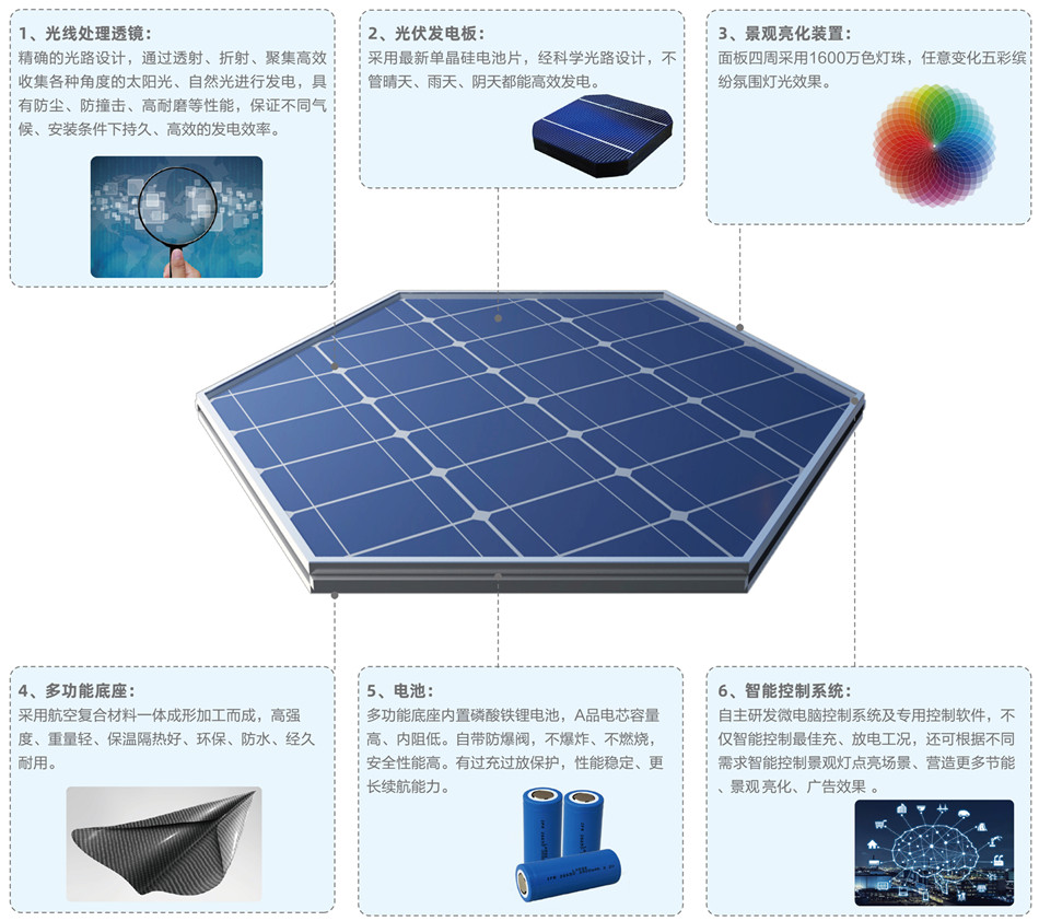 ①采用??榛杓?、可任意拼装,进行科学光路设计对各种角度的太阳光进行折射、聚焦后再高效发电,光线利用率比普通光伏高30%以上;