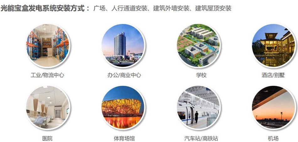 光能宝盒发电系统应该场景广泛于工业厂房、物流中心、办公场所、学校、医院、体育场馆、展览馆、动物园、植物园、海洋馆、部队、港口、机场、火