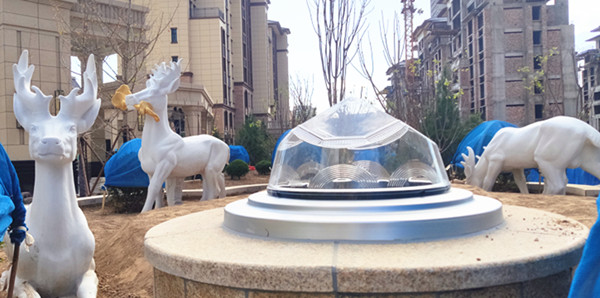 花型和圆形的蹲座与无电照明系统钻石型采光器相得益彰,极具艺术气息,瞬间就拉升整个小区的绿色景观品位!目前为止,笔者也是第一次见到大理石花型的墩座,高档小区配置就是高规格!