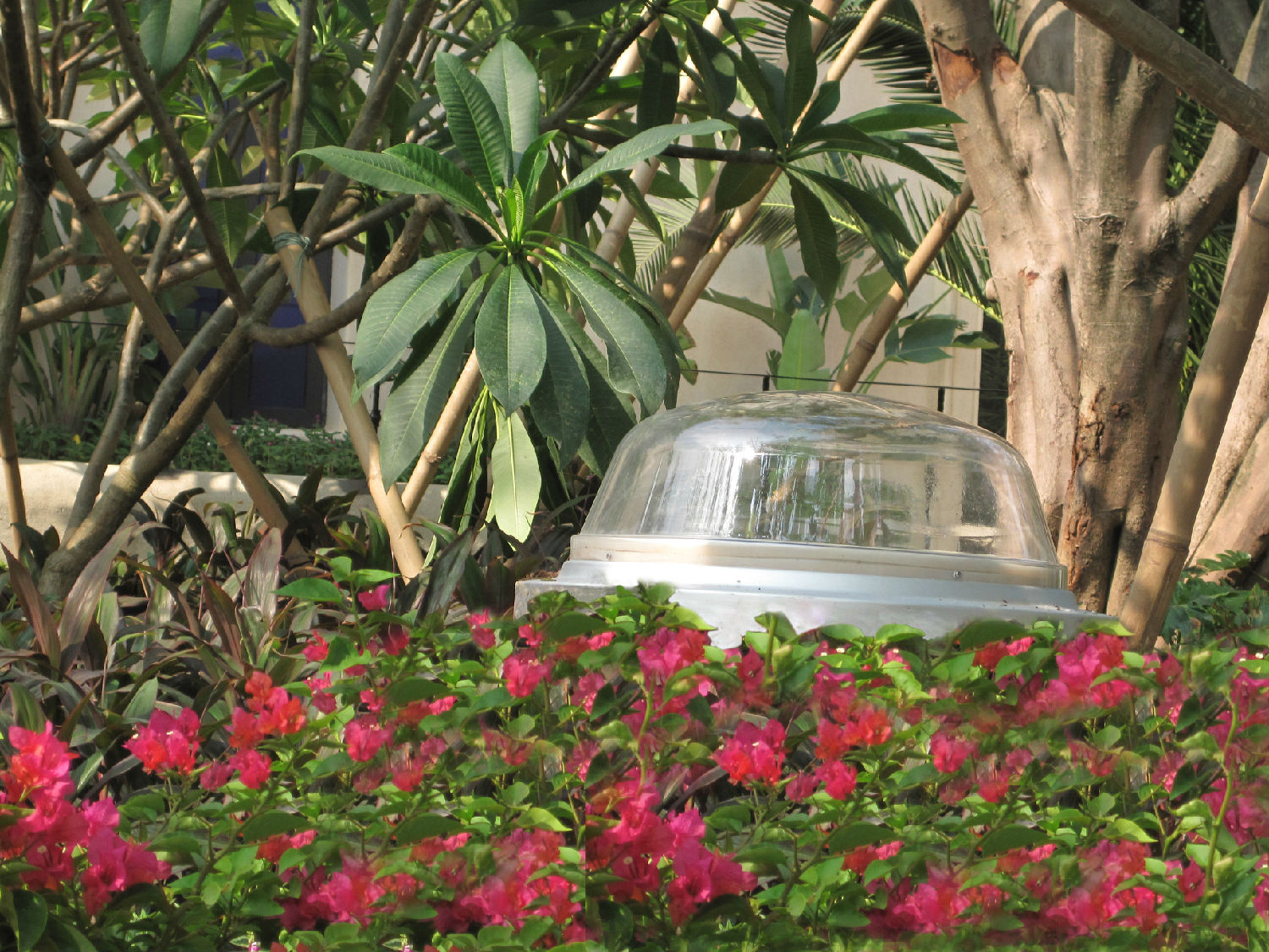 美林湖商业街的营销中心前面的草地上,可以看见有几个低调又不失优雅的采光罩,高透光的类特警盾牌PC材料做成的采光罩旁边有银白色的铝圈装饰。