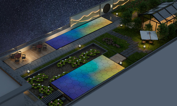 在日光的照耀下,光能发电地砖如同一片片熠熠生辉的宝石,为别墅增添了无尽的光彩。而到了夜晚,这些地砖则化身为节能的照明设备,将储存的电能转化为柔和的光芒,发出五颜六色的光线,为别墅营造出温馨而宁静的氛围。