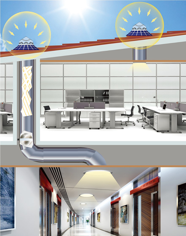 光导管照明结合发电式防雨装置或市电,利用发电式防雨装置白天所发的电或市电带动特制LED夜间补光装置为夜间提供照明,电光源和自然光之间通过智能恒光控制器实现全自动智能控制,自然光差多少,电光源就自动补多少,不管外部天气、照度如何变化,都能全天候满足室内恒定的照明光线需求。