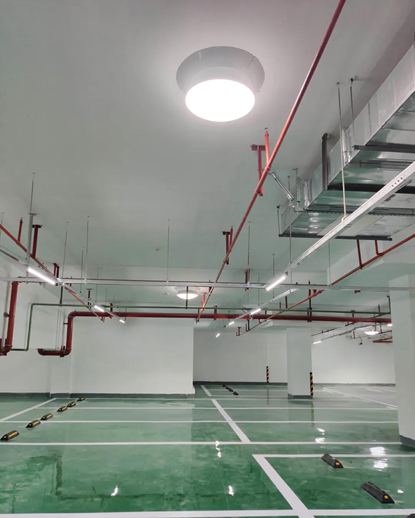 光导照明系统通过室外的采光装置收集室外的自然光,经过光导管装置强化并高效传输到室内漫射器,均匀将光线导入地下车库,使得地下车库的光线一直保持充足。