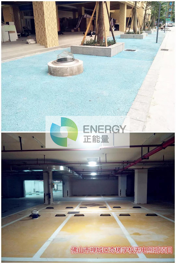 为展现学校的生态化、智能化、国际化。选用了“零污染、零排放”的佛山正能量光导照明系统。该系统所用材质均为环??苫厥詹闹剩话沧坝谑彝獾牟晒庹植捎玫鹿荻胖蔖C材质制成,抗冲击、抗老化、抗污(因添加了纳米抗污技术,具有自动清洁功能)。在收集自然光的时候能将90%的有害紫外线及热量过滤掉,在通过导光管传送至漫射器。漫射器将光打散后传送至室内各个角落。使用全程无需市电,不受停电及天气的影响。在天气不佳时自带的补光系统将及时补光,达到最佳照明。2-3年收回成本。质量保用25年。